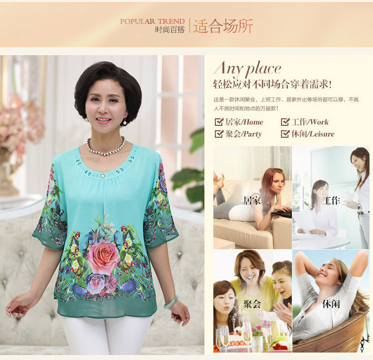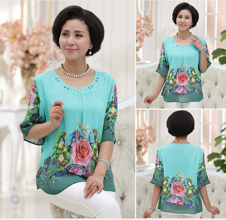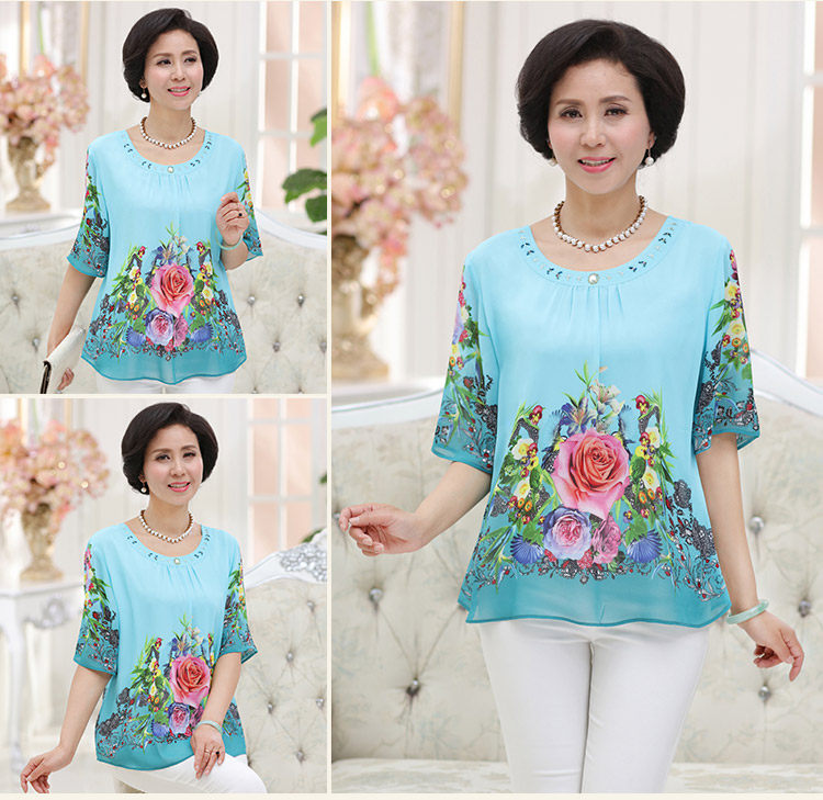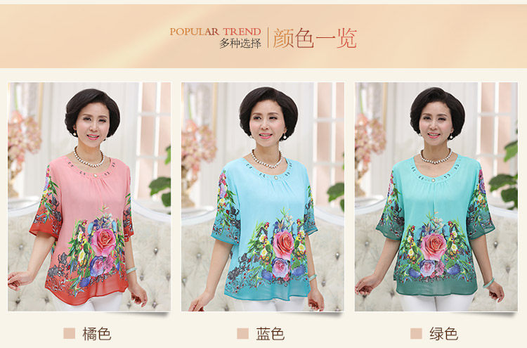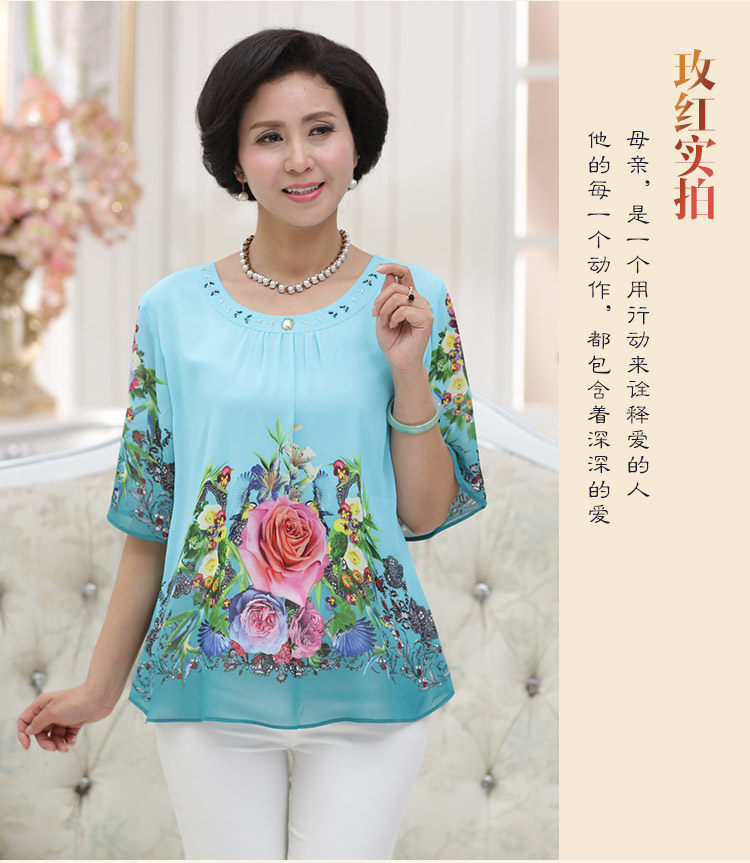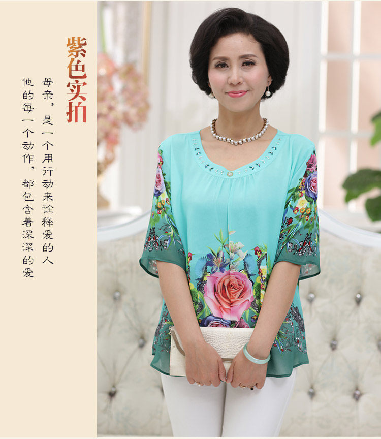 中老年女装夏装手绘短袖雪纺衫大码宽松夏季高档妈妈装T恤上衣
