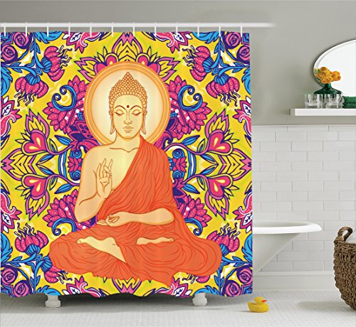 Ambesonne Buddha Decor Collection, Sitting Buddha on Ornate Mandala Round Pattern with Flowers and Love Esoteric Illustration, Polyester Fabric Bathroom Shower Curtain, 84 Inches Extra Long, Multi