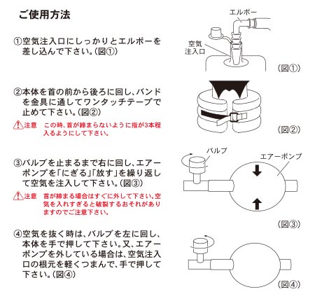 | ご使用上のご注意 | ●本品は医療機器ではありません。疾病の治療用としてご使用しないでください。 ●18歳未満の方は、骨格の成長期にあたるのでご使用しないでください。 ●使用箇所が現在治療中の方は、本品のご使用について専門医にご相談ください。 ●就寝時はご使用しないでください。 ●ご使用中またはご使用後に異常を感じた場合は直ちにご使用を中止してください。 ●お肌に合わない場合やかぶれ、かゆみ等を感じた場合はご使用を中止してください。 ●傷・かぶれ・湿疹などのある場合にはご使用しないでください。 ●空気を入れ過ぎると破損するおそれがあります。 ●汚れた場合は固く絞った柔らかい布などで拭き取ってください。 ●乳幼児の手の届かない場所に保管してください。 ●火気のそばや高温多湿な場所、直射日光の当たる場所には保管しないでください。 ●本来の目的以外ではご使用しないでください。 ●廃棄する場合は、各自治体の指示に従って処分してください。 ●印刷の都合上、実際の商品と多少色が異なる場合があります。 |
