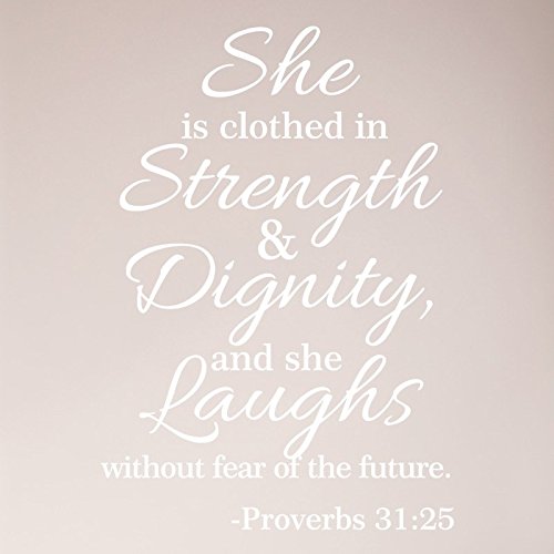 -. Binding : Kitchen -. Brand : WallPressions -. Feature : Size: 32"x24" / Your Choice of Colors / High-Quality Die-Cut Oracal Vinyl Made In the USA / Written & Video Instructions Included / Will not damage walls Non-transferrable -. IsAutographed : 0 -. Label : Wall Pressions -. Manufacturer : Wall Pressions -. ProductGroup : Home -. ProductTypeName : HOME -. Publisher : Wall Pressions -. Studio : Wall Pressions -. Title : 32"x24" Proverbs 31:25 She Is Clothed in Strength and Dignity and She Laughs Without Fear of the Future Wall Decal Sticker Scripture Bible Verse Quote Art Mural Christian God Nursery Girl Woman