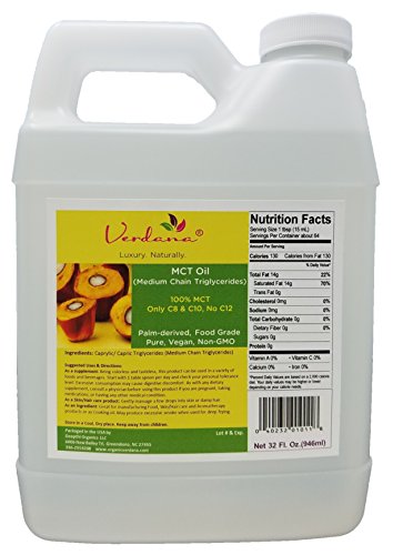 INCI Name: Caprylic/ Capric Triglycerides. Organic Verdana Food Grade MCT oil 32 fluid ounce is made from food grade Palm oil and consists of almost completely C8 and C10 (Caprylic and Capric) which are medium chain triglycerides. Other brands tend to have a significant amount of C12 oil (Lauric acid) which is actually a 'long' chain oil. Our product is Colorless, Odorless and with very long shelf life and is a fractionated oil. (There is no such thing as 'organic' MCT oil. Such claims by some vendors are not true. The 'fractionation' process by definition is not organic. But it is possible to make sure that the fractionation process is responsible and that it does not impart harmful synthetics into the product. Beneficial For The Skin: Organic Verdana feather-light MCT oil heals and softens damaged and dry skin. Since the MCT oil is easily absorbed into the skin, it won't clog pores and you'll never be left with the 'greasy' feeling of other plant-based carrier oils. Being 100% saturated fatty acid, it is a quick energy oil as it gets absorbed in the digestive system without the aid of digestive enzymes and bile acids etc., Our MCT oil is 100% pure, non GMO and batch tested for purity. It is great for sports nutrition and keto diet enthusiasts. Perfect Carrier Oil for Aromatherapy and Massage: Completely soluble with all essential oils and is colorless, odorless and can be used for very long periods when stored in correct conditions. This MCT oil is ideal for massage, as well as mixing with other carrier oils and essential oils. (Buyers are responsible to take adequate precautions and conduct their own tests to confirm suitability of this product for the intended use including regulatory requirements).Feature