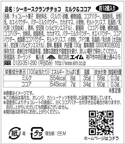 原材料:<ミルク>砂糖、植物油脂、ココアバター、脱脂粉乳、全粉乳、ホエイパウダー、バターミルクパウダー、カカオマス、小麦粉、モルトクリスプ、乳脂肪/乳化剤(大豆由来)、香料、安定剤(ソルビタンエステル)、膨張剤<ココア>砂糖、植物油脂、ココアバター、全粉乳、脱脂粉乳、カカオマス、バターミルクパウダー、ホエイパウダー、ココアパウダー、低脂肪ココアパウダー、モルトクリスプ、小麦粉、ブドウ糖、乳脂肪/乳化剤(大豆由来)、安定剤(ソルビタンエステル)、香料、膨張剤