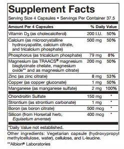 Provides calcium and other nutrients, critical to building and maintaining healthy bones. Provides calcium and other nutrients, critical to building and maintaining healthy bones. Please see image of "Supplement Facts" label for full list of ingredients.This product is free of the following common allergens: milk/ casein, eggs, fish, shellfish, tree nuts, peanuts, wheat/gluten, corn, yeast, and soybeans. Contains no artificial colors, flavors, or preservatives. This product contains MCHC that is certified bovine spongiform encephalopathy (BSE) free.Feature