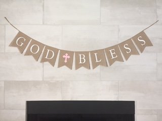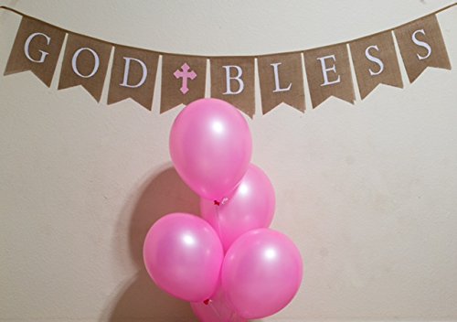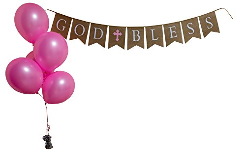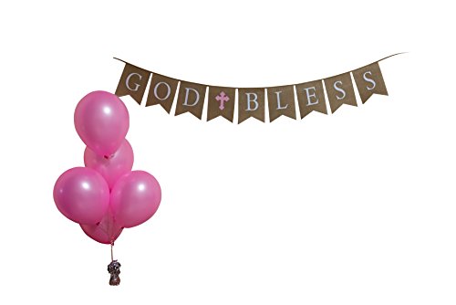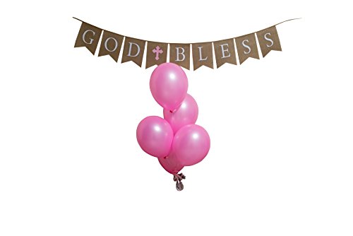 God Bless Burlap Girl Banner - Baptism - First Communion - Christening - Baby Shower - 5 Pink Latex Balloons