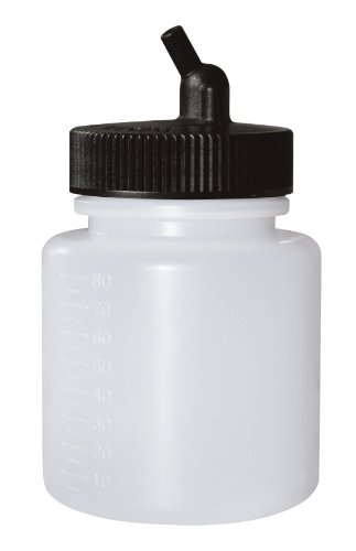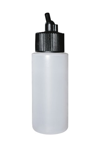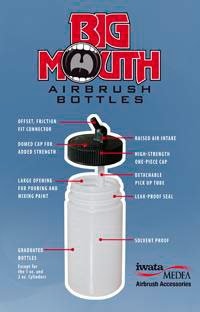 This 2 ounce (60CC) Big Mouth Bottle by Iwata has a large opening for pouring and mixing your paint. The offset connector allows larger diameter bottles to affix easily. A raised intake creates a splash proof opening. The high-strength one-piece cap is domed for extra strength and features a detachable pick-up tube. Solvent proof, easy to clean with leak proof seal.Feature