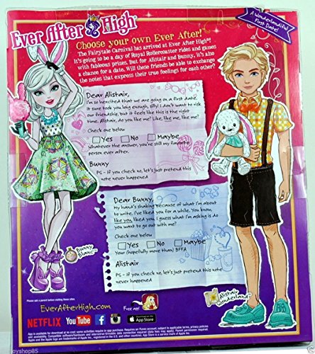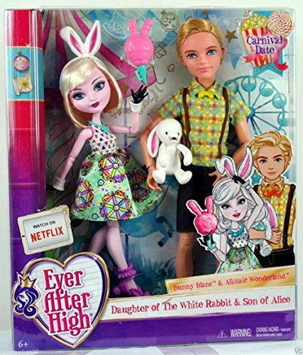 -. Binding : Toy -. Brand : Mattel -. EAN : 0887961216141 -. Feature : Ever After High students Bunny Blanc and Alistair Wonderland are dressed for a date at the fair in signature-style outfits. / Both characters hail from Wonderland -- Alistair is the curious son of Alice and Bunny is the timely daughter of the White Rabbit. / The duo look wonderland-iful in outfits that incorporate bright colors and fun P.R.Ints. / Alistair Wonderland is dashing with suspenders and bow tie. / Bunny Blanc is dressed in her fair-est with a ferris wheel P.R.Int and bunny ear headband. -. IsAdultProduct : 0 -. Label : Mattel -. Manufacturer : Mattel -. MPN : DHL79 -. PackageQuantity : 1 -. PartNumber : DHL79 -. ProductGroup : Toy -. ProductTypeName : TOYS_AND_GAMES -. Publisher : Mattel -. Studio : Mattel -. Title : Ever After High Carnival Date Doll 2-Pack - Bunny Blanc and Alistair Wonderland -. UPC : 887961216141