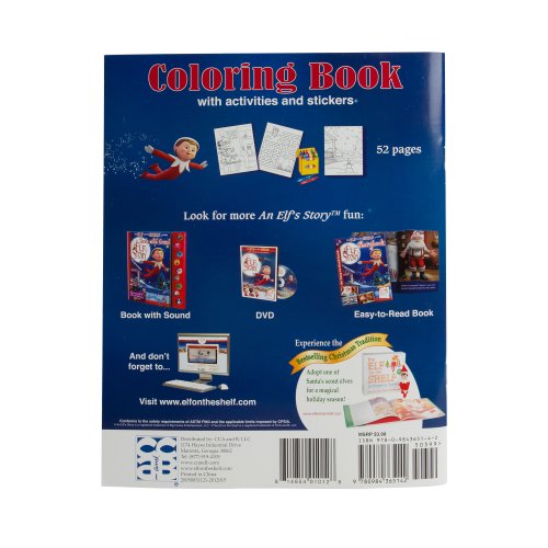 -. Binding : Toy -. Brand : The Elf on the Shelf -. EAN : 9780984365142 -. Feature : An Elf's Story 50 page coloring book! / Includes scenes from your favorite holiday special / Color all of your favorite characters! / Also includes stickers / For ages 3+ -. ISBN : 0984365141 -. Label : The Elf on the Shelf -. Manufacturer : The Elf on the Shelf -. Model : AESCOBK -. MPN : 113010010128 -. PackageQuantity : 1 -. PartNumber : 113010010128 -. ProductGroup : Toy -. ProductTypeName : TOYS_AND_GAMES -. Publisher : The Elf on the Shelf -. ReleaseDate : 2013-07-28 -. Studio : The Elf on the Shelf -. Title : An Elf's Story Coloring Book -. UPC : 814854010128 -. Warranty : No Warranty