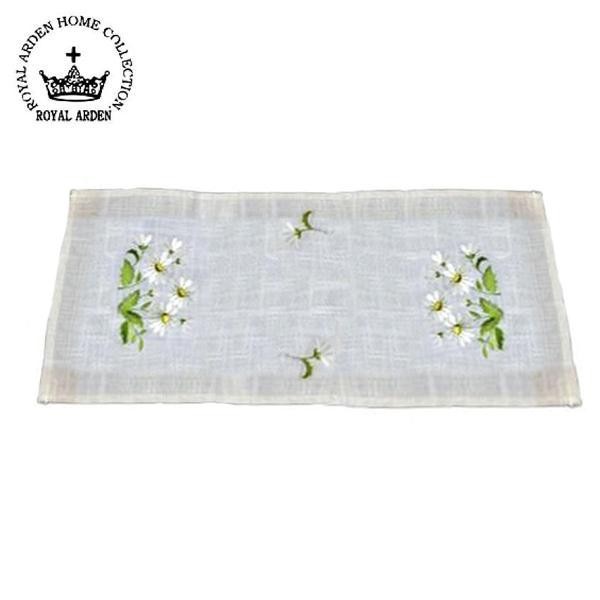 花柄の刺繍がおしゃれなトップクロスです。 製造国:中国 素材・材質:【生地】ポリエステル97%麻3%【刺繍】上糸:レーヨン100%下糸:ポリエステル100% 商品サイズ:約35×80cm 仕様:手洗い可 ※サプライヤー直送品 ご注文後5~6営業日後の出荷となります【商品名】ロイヤルアーデン トップクロス(テーブルランナー) M スモールデイジー 78323