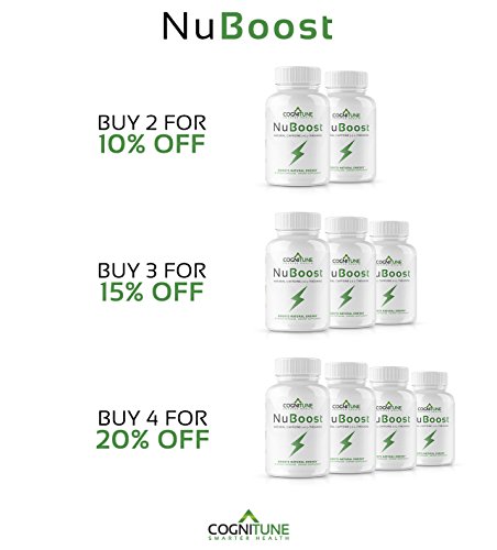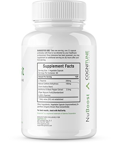 -. Binding : Health and Beauty -. Brand : COGNITUNE -. Feature : PREMIUM ENERGY SUPPLEMENT - Our fast-acting energy booster is the perfect formula for peak mental & physical performance. Boost natural energy & alertness, enhance focus & brain power, spark weight loss & fat burning, & ignite your limitless mind & body with NuBoost. Safe energy & pre-workout blend for all ages. / SMOOTH & SUSTAINED FOCUS - Experience invigoratingly smooth mental and physical energy with a precise blend of Natural Caffeine, L-Theanine, and BioPerine (Black Pepper Extract) working together in perfect synergy. Absolutely no crash and no jitters with our quick release and long-lasting focus and energy formula. / WEIGHT LOSS & METABOLISM - Carefully extracted from Arabica Beans, our natural caffeine stimulates thermogenesis, accelerating the rate at which your body burns calories at rest. NuBoost was scientifically formulated to increase fat oxidation in both men and women for quick and easy healthy weight management. / HIGHEST QUALITY GUARANTEE - Proudly made in the USA, NuBoost is carefully formulated in an FDA Registered facility following strict (GMP) Good Manufacturing Practice standards and guidelines. Our energy and focus enhancer is guaranteed to be Non-GMO, Vegan Friendly, Gluten Free, Soy Free, Allergen Free, Third Party Tested & Lab Verified. This means you get exactly what it says on the bottle and nothing less. / 100% MONEY-BACK GUARANTEE - Unlike other vitamins, diet pills, or supplements for energy and weight loss, trying NuBoost has absolutely zero risk to you! If you're not completely satisfied, we offer a hassle-free 60-day money back guarantee. Fix brain fog, thrive in any situation, & unlock your natural energy, risk-free. -. IsAdultProduct : 0 -. Label : COGNITUNE -. LegalDisclaimer : Not intended for persons under the age of 18. Do not use if pregnant or nursing. Consult with a healthcare professional P.R.Ior to consumption if you have any medical conditions or take any prescription. Keep out of reach of children. -. Manufacturer : COGNITUNE -. MPN : NUB01 -. PartNumber : NUB01 -. ProductGroup : Health and Beauty -. ProductTypeName : HEALTH_PERSONAL_CARE -. Publisher : COGNITUNE -. Studio : COGNITUNE -. Title : NuBoost - Premium Sustained Energy Supplement - All Natural Caffeine Pills with L-Theanine + BioPerine - Smooth Instant Energy & Focus - No Crash, No Jitters - Weight Loss & Brain Booster