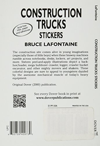 Studio : Dover Publisher : Dover Binding : Misc. Product Description DOVER PUBLISHING-Little Activity Books: Construction Trucks Sticker Booklet. These colorful stickers are perfect for fun at home, school or on the go! The mini size is perfect for road trips! Book measures 5-1/2x4 inches and has 4 pages with a total of 15 stickers. Rendered by Bruce LaFontaine. Made in USA. 0