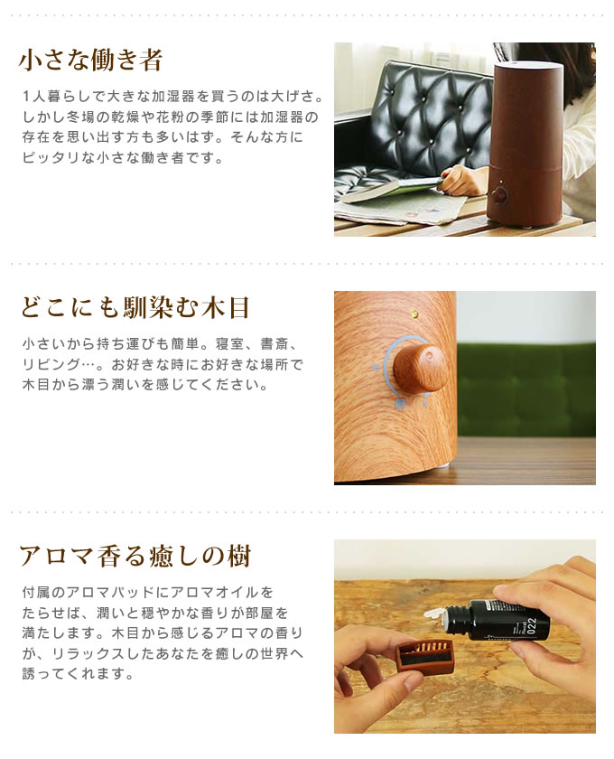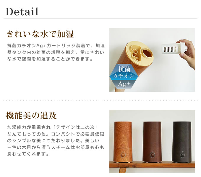 | ポイント | 本体に抗菌カチオンAg+カートリッジを搭載し、進化した美しいミストを届けます。 本物の樹のようにお部屋の空気をきれいにしてくれる小さな「樹」は、まるで森からあなたへのおくりもの。 置く場所を選ばない小さな働き者は、きれいなミストできっとあなたの心にもお部屋にも潤いをもたらしてくれます。 |