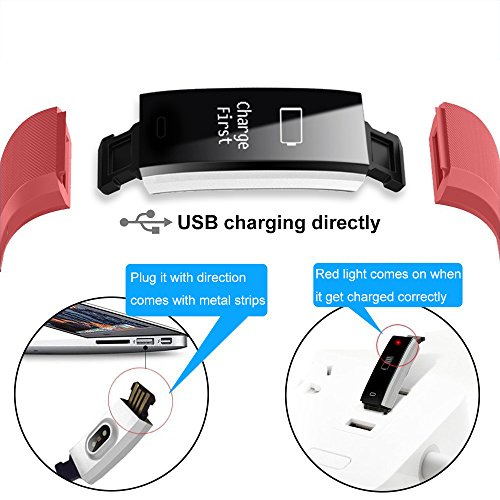 ✔LONGER BATTERY LIFE&WATER RESISTANCE: IP67 waterproof washing your hands, getting caught in the rain will not damage your fitness watch. Charging time 1 hour for 7 days standby smart bracelet using. Take the entire wristband off and snap the gold usb plug inside a usb charger anywhere. No extra cable hassle.