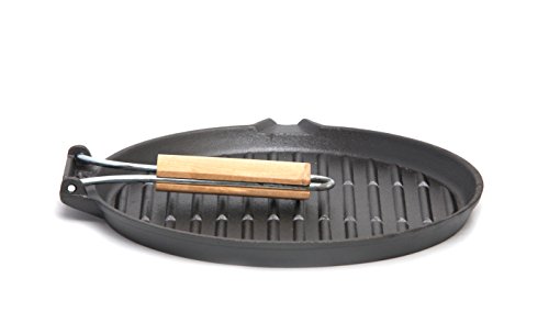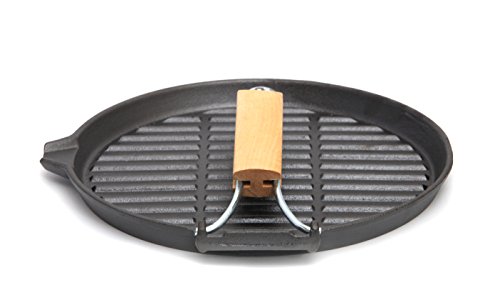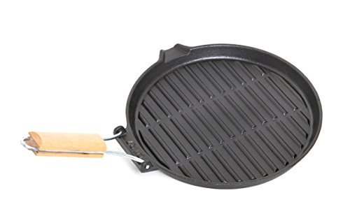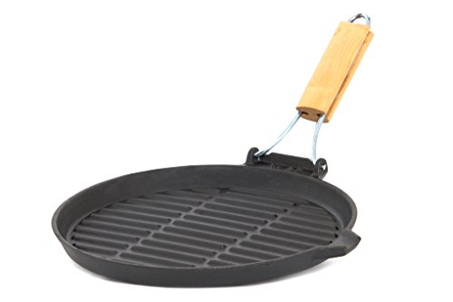 Modern designed round griddle with a folding wooden handle. Ideal for grilling hamburgers, steaks, vegetables, fish & more. Perfect for outdoor use.
