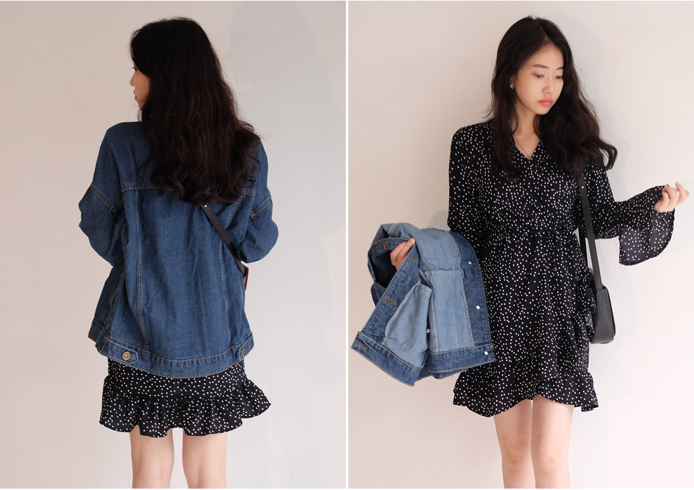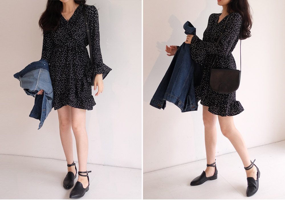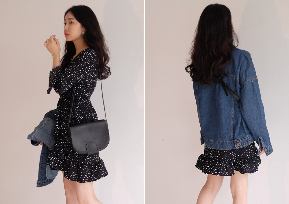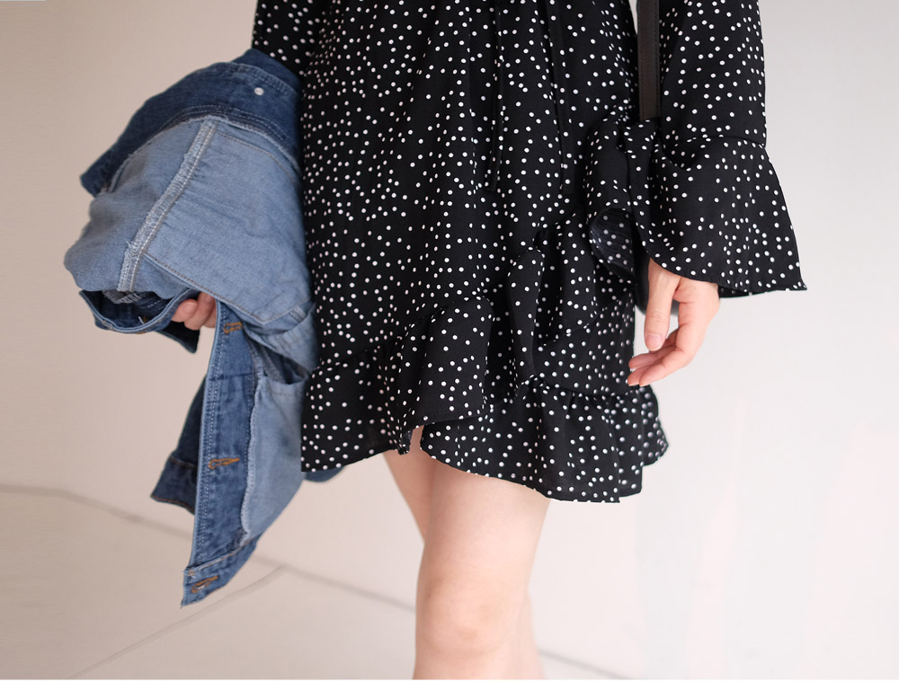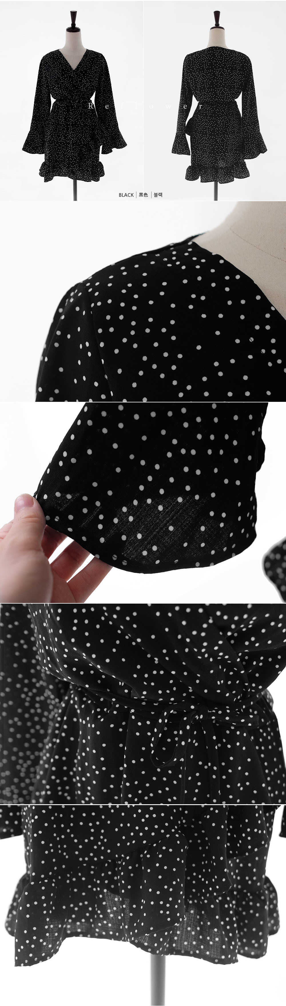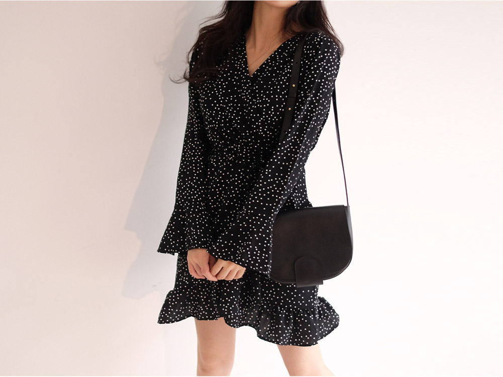 도트패턴으로 페미닌한 느낌을 주는 랩스타일 원피스예요