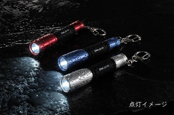衝撃や水に強い軽量アルミボディのLEDライトです。滑りにくいラバーグリップ。携帯に便利なキーホルダー付き。