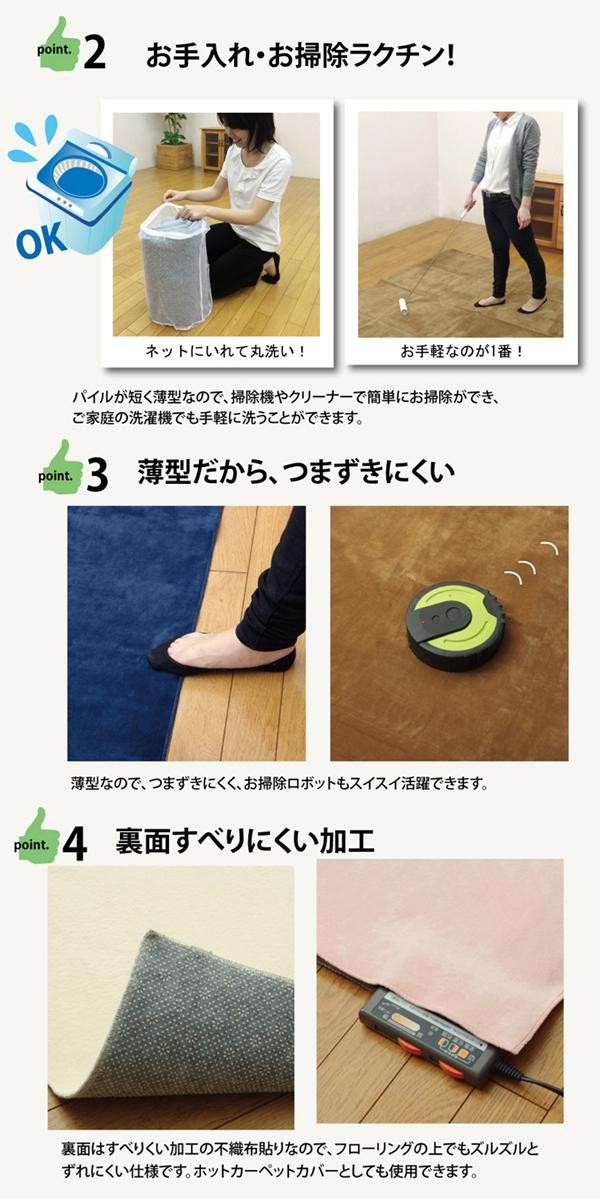 ソフトな肌触りのラグです。ホットカーペット、床暖房対応で保温性もあり、サラリとしていますので、べとつかず暑い時期にもご使用頂けるオールシーズン仕様です。 |