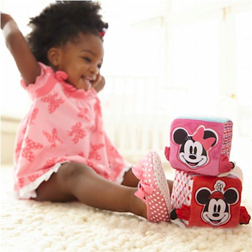 Builds character! Soft, fuzzy and squeezable, Minnie's ruffled plush blocks make crinkle, bell and rattle sounds to delight your tiny builder.
