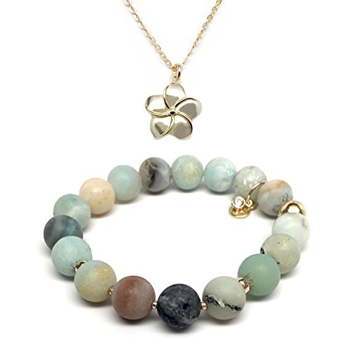 -. Title : Set 10mm Green Amazonite Sophia 7" Stretch Bracelet 12mm Flower Charm 16" gold Necklace