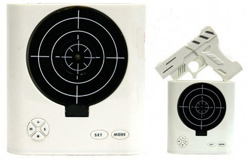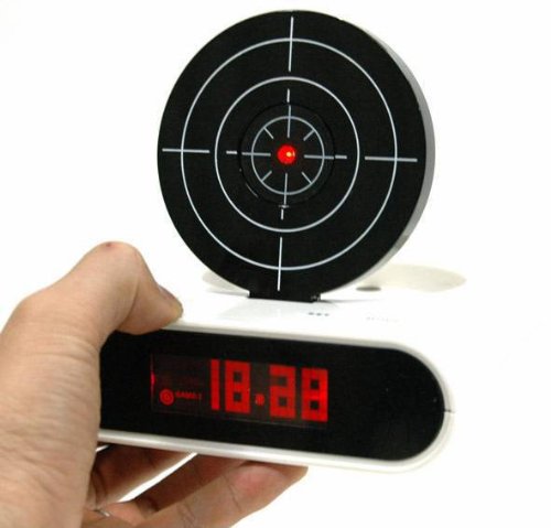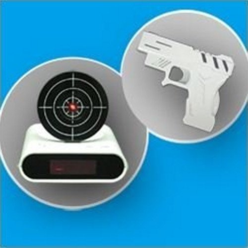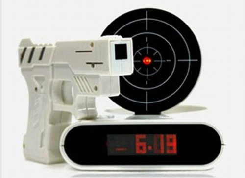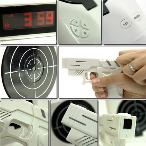 -. Feature : 商品内容 : 時計本体・ピストル・英文、中文説明書 / 電池 : 単三電池計6本 (時計4本、ピストル2本) ※電池は付属いたしません。 / 使い方 : アラームをセットします。セットした時間になるとアラームが鳴り出しますので的に向かってピストルを撃ちます。 / こんな方にオススメです : 目覚ましで起きても二度寝してしまう... 寝起きに頭、体を使いたい... 射撃の腕を磨きたい...etc