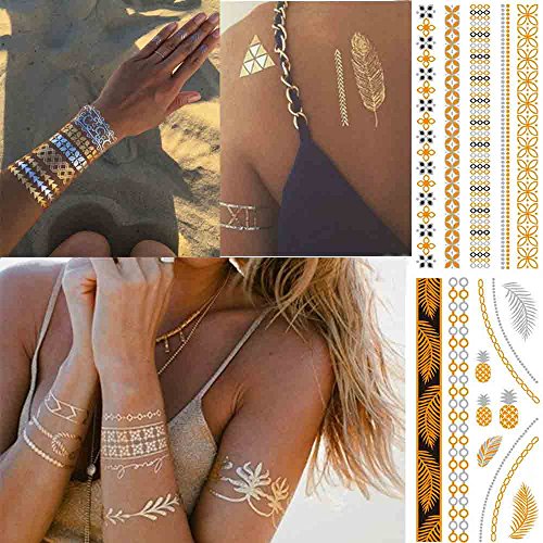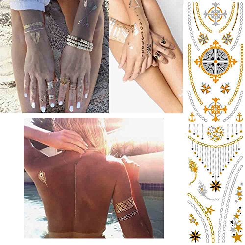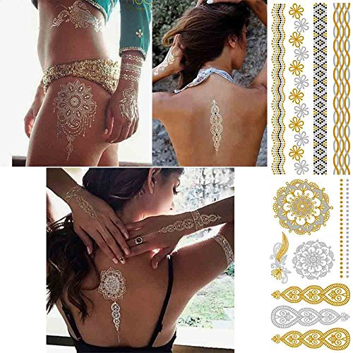 Metallic Temporary Tattoos, 10 Sheets, Black Gold Sliver Multi-Colored Waterproof Flash Tattoo, Sexy Body Tattoo Sticker for Women & Girls