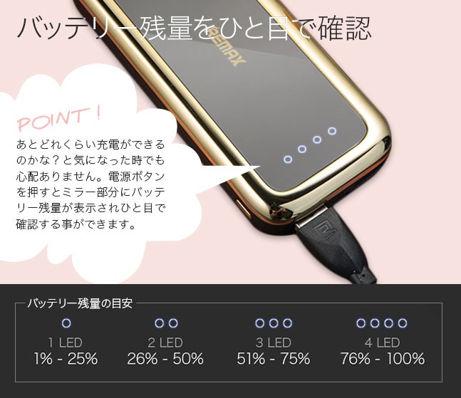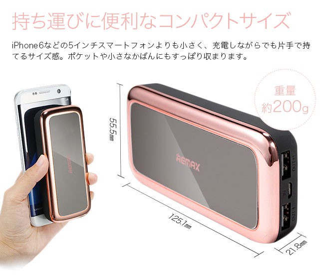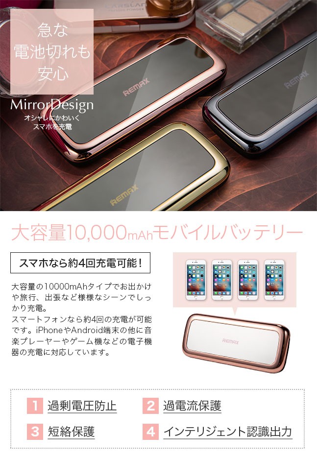 | 特徴 | ハンディサイズで持ち運びにも便利なモバイルバッテリー ちょっとしたお出かけや旅行、会社や学校、出張や出先などで スマホやタブレットの電池切れに悩む事はありません♪ オシャレでスタイリッシュなミラーデザインは、飾りではなく 鏡としても使用できて機能的♪ たっぷり大容量10,000mAhでiPhone6なら約4回充電が可能。 USBポートも2つあり最大2台へ同時充電が可能。 これ1つさえあれば、様々な端末の充電ができちゃいます バッテリー残量がひと目でわかるLEDランプを搭載。 ボタンを押すとLEDランプが点灯し、点灯したランプの数でバッテリー残量が確認できます。 ランプの数が少なくなってきたら充電のタイミング スマホへの充電もとっても簡単。 バッテリーとスマホをケーブルで接続するだけで充電開始充電が終わったらケーブルを取り外すだけ。 |