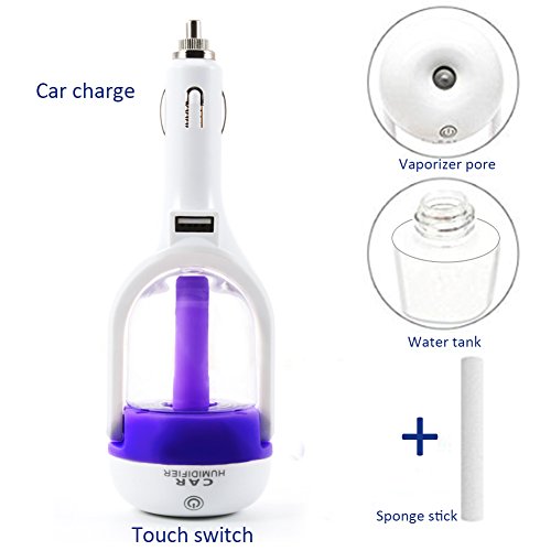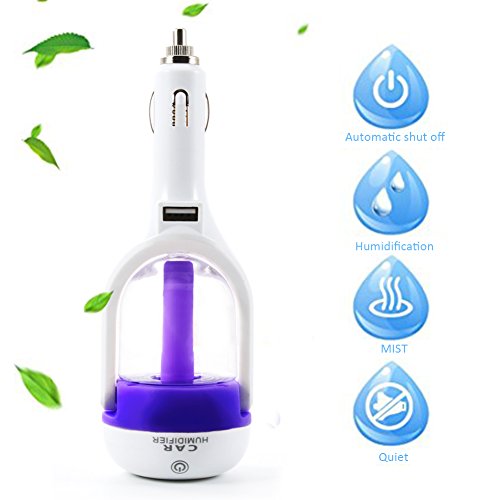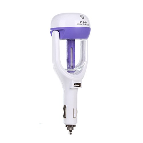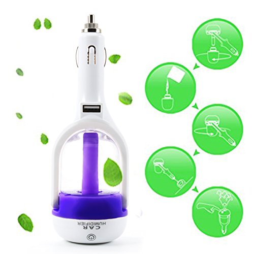 Car Humidifier, Mini USB Car Charger Humidifier Aroma Diffuser Air Freshener Purifier Aromatherapy Mist Maker with 180 Degree Rotation, Suit for Water Soluble Essential Oils, Water Purple