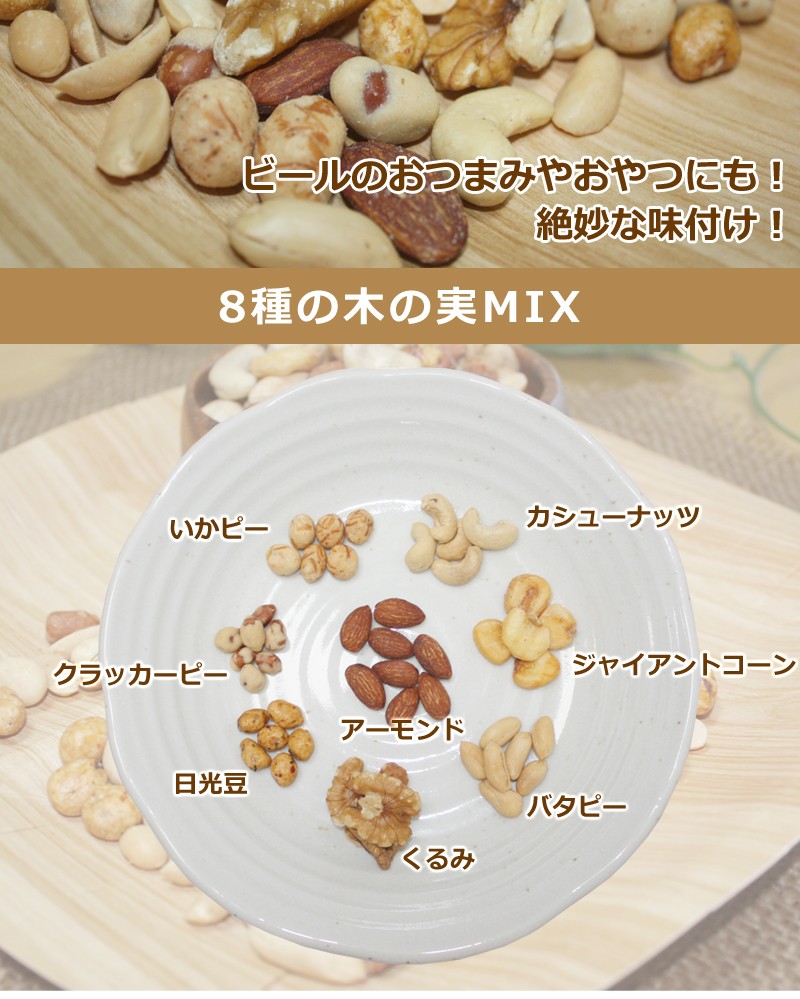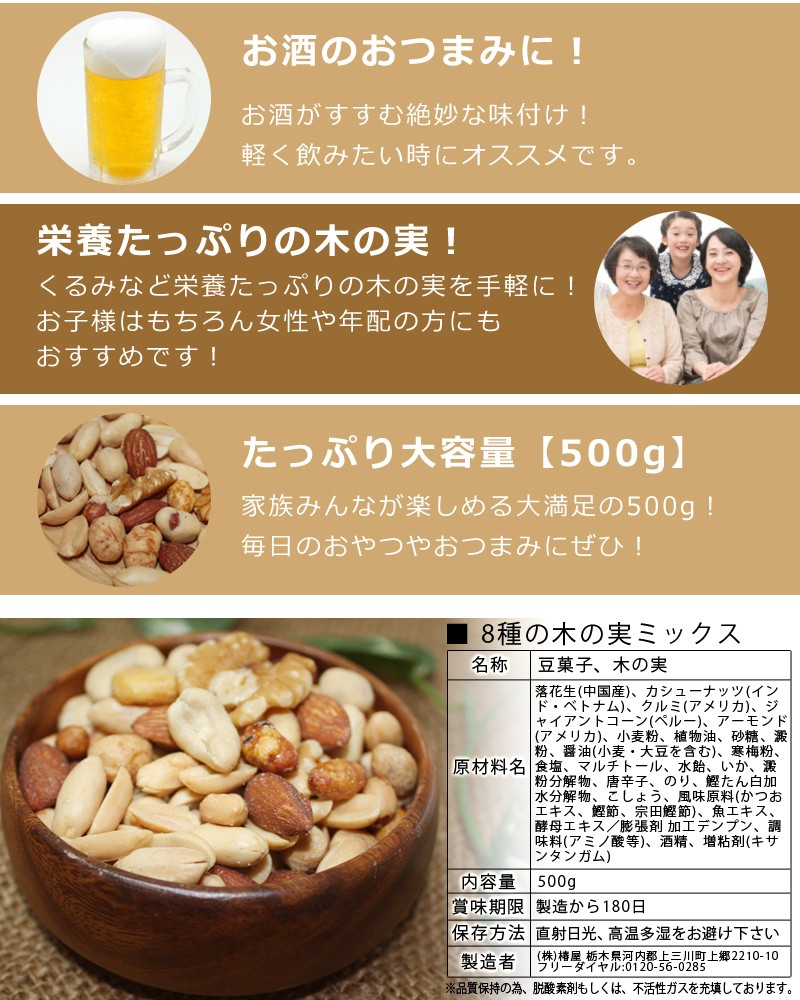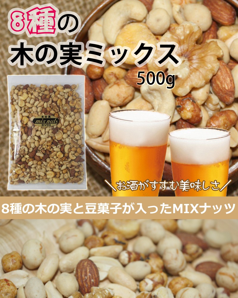 ビールのおつまみやお子様のおやつにも!たっぷり500g!木の実・豆菓子8種類のミックスナッツ!木の実を食べて毎日健康!一握りの木の実を食べよう!木の実に含まれる栄養が健康に良いと一昨年のブームとなりクルミなどの特集TVも報道されました。適度に食べると健康に有益な食物です。