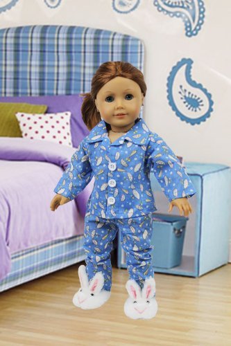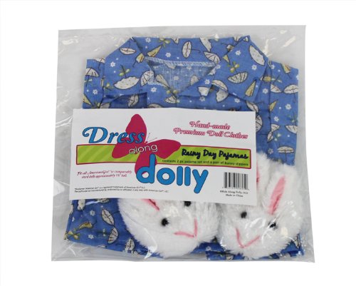 3 Piece Rainy Day Pajamas with Bunny Slippers Outfit - Fits 18" American Girl - Doll Clothes (Includes 2 Piece Umbrella Themed Pajamas and Pair of Bunny Slippers): From the makers of the best selling Ride Along Dolly Bike Seat comes a line of doll clothes that will make your favorite American Girl or comparably sized dolls' heart melt. Dress Along Dolly Clothes are all hand made, and custom designed to give your doll the unique look that you want. You won't find these clothes in any store. These are truly unique designs exclusive to Dress Along Dolly. Show off your doll in style. Fits any standard doll of approximately 18" in height, including American Girl Dolls.Feature