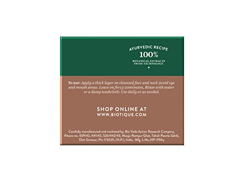 -. Feature : Apply a thick layer on cleansed face and neck Avoid eye and mouth areas. Leave on for15-20 minutes, Rinw-with water or a damp washcloth. Use daily or as needed. / Multani mitti (Fuller's earth), Gem (Red ochre), Yasad bhasm (Yasad bhasm), Badam (Prunus amygdalus), Pudina (Mentha arvensis), Kikar gaund (Acacia arabica), Surajmukhi (Helianthus annus), Paste Base Q.S. / Biotique is based on 5000-year-old Ayurvedic recipes known to integrate and celebrate body, mind and spirit. This is th eheritage and harmony of all Biotique products, blending proven Ayurvedic therapies with the science of 21st century bio-technology. / Organically Pure & preservative free, dermatologist tested for safety, no animal testing / An extraordinary combination of ancient/modern therapies and sciences that balance the wonders of nature to support healthy well-being and spiritual bliss in your life.