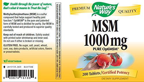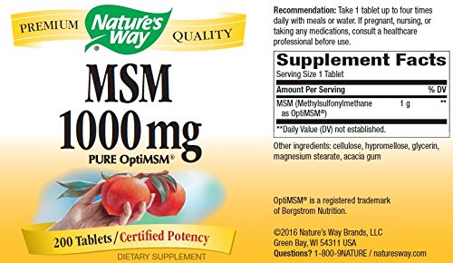 -. Binding : Health and Beauty -. Brand : Nature's Way -. Label : natures way -. Manufacturer : natures way -. ProductGroup : Health and Beauty -. ProductTypeName : HEALTH_PERSONAL_CARE -. Publisher : natures way -. Studio : natures way -. Title : Nature's Way MSM 1000mg