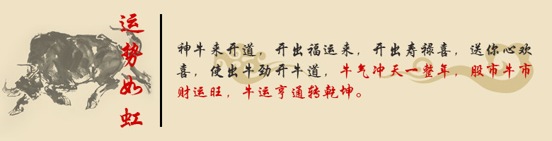 金牛来开道,开出福运来,开出寿禄喜,送你心欢喜,使出牛劲开牛道,牛气冲天一整年,股市牛市财运旺,牛运亨通转乾坤。“运势”指“走势”,笨拙的劲牛,象征埋头苦干的精神。