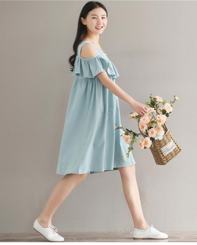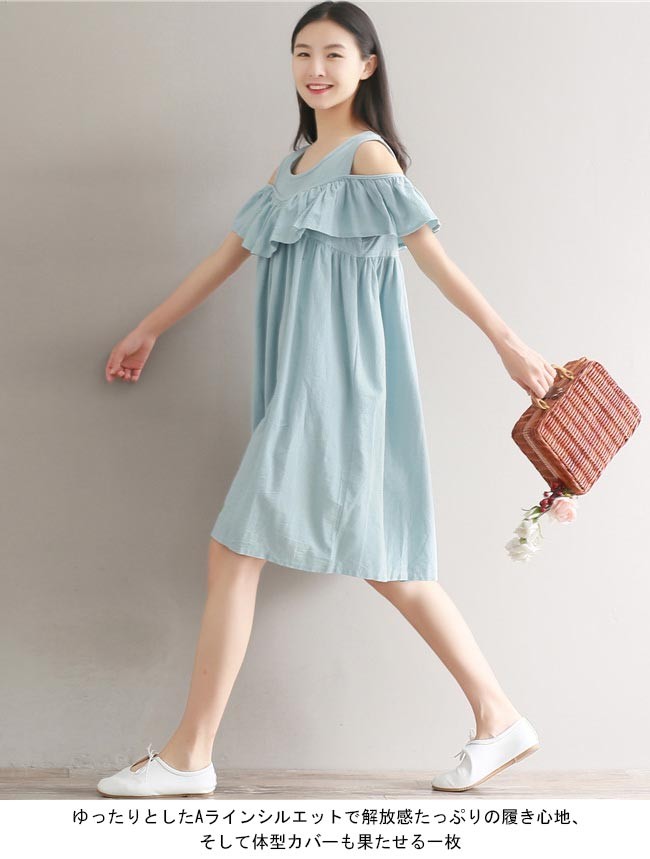 ワンピース オフショルダー レディース 半袖ワンピース 体型カバー 薄手 夏物 ゆったり 膝丈ワンピース 肩出し フリル付き バストアップレディース用のワンピースが登場優雅なオフショルダーデザインで気質アップ効果抜群胸元にフリルが施され、甘さを増しながらバストも果たせる緩やかな大きめV字型で淑やかなレトロ感を演出爽やかなライトブルーの色合いはとても夏らしい・若い女性らしい雰囲気を醸し出すゆったりとしたAラインシルエットで解放感たっぷりの履き心地、そして体型カバーも果たせる一枚カラー:写真色素材 ポリエステルサイズ(cm) M L XL 2XLM バスト98 総丈91L バスト102 総丈92XL バスト106 総丈932XL バスト110 総丈94ご注意:※サイズは平置きサイズです。素人採寸ですので、若干の誤差がございます、ご了承ください。