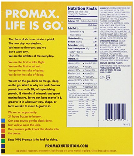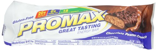 -. Feature : Box of 12 bars; 75g each / 20g of replenishing protein, 18 vitamins and minerals, and great tasting flavors / Certified Gluten-Free, Kosher and Vegetarian / Use Promax bars pre-activity for energy and post-activity for recovery / No artificial sweeteners or preservatives, high fructose corn syrup, maltitol or gelatin