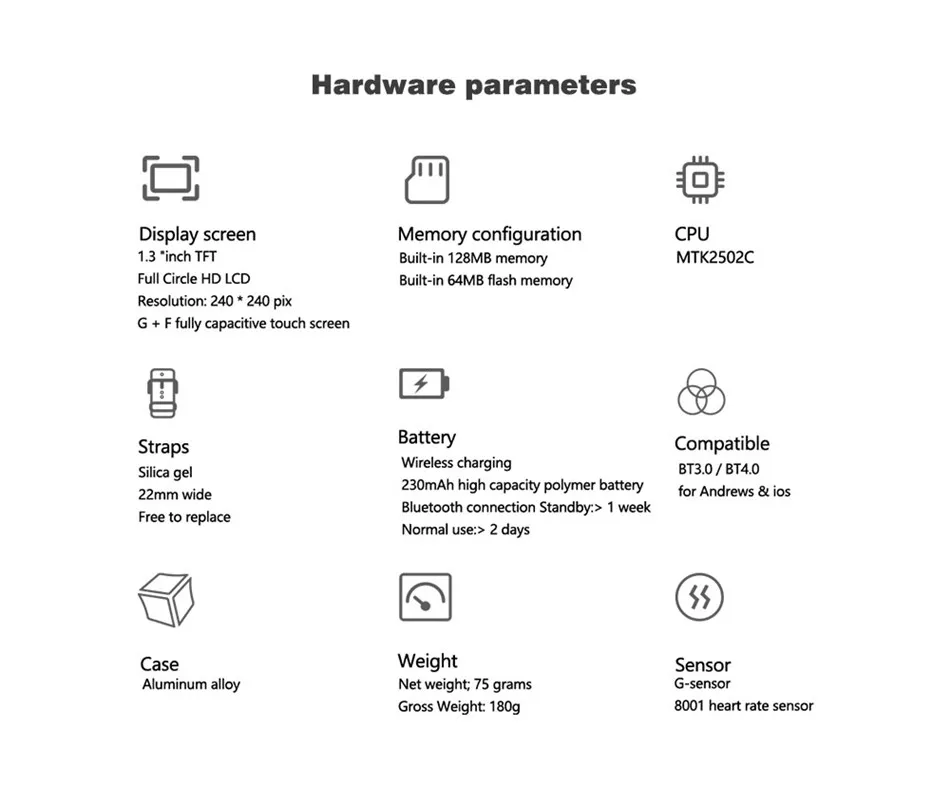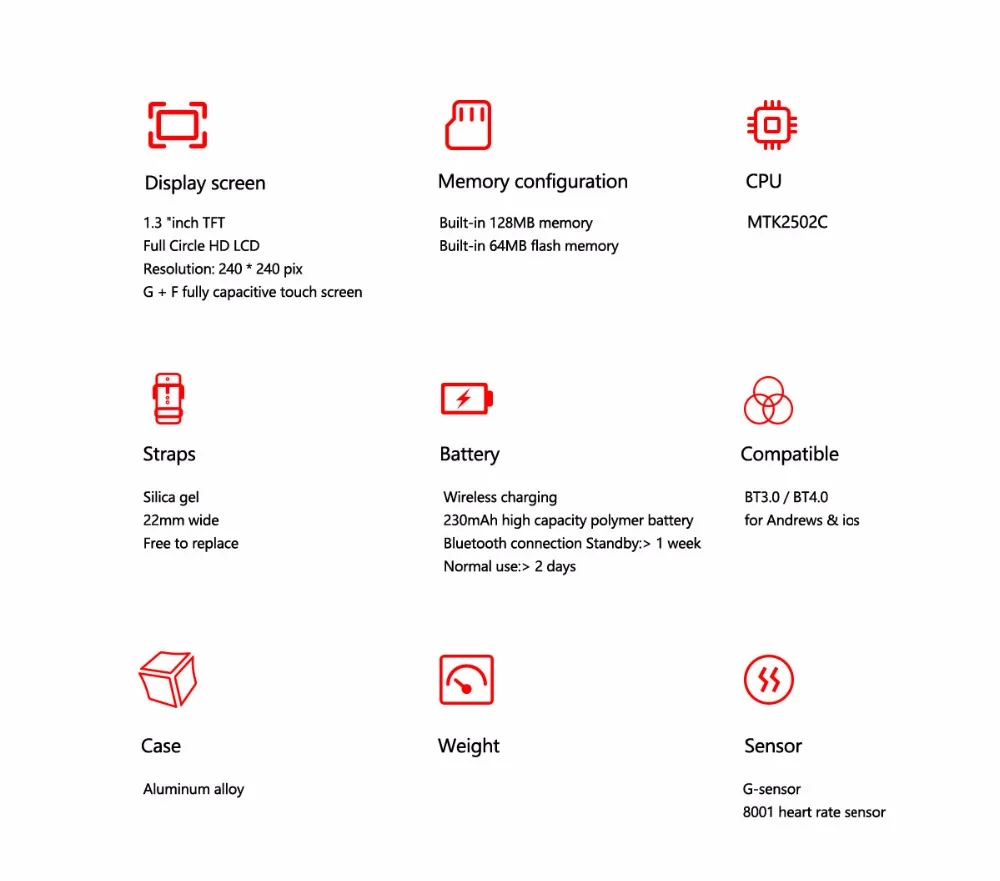 Function:Answer Call,Remote Control,Interactive Music,Month,Countdown,Message Reminder,Sleep Tracker,Heart Rate Tracker,Call Reminder,Calendar,Alarm Clock,Passometer,World Time,Fitness Tracker