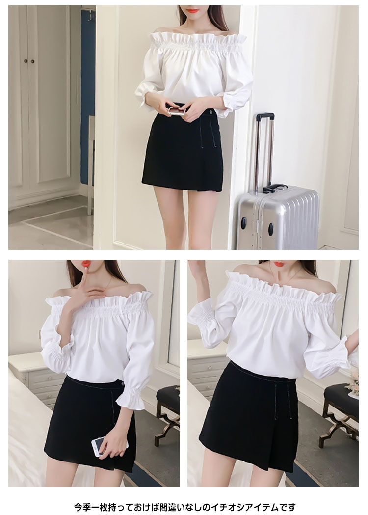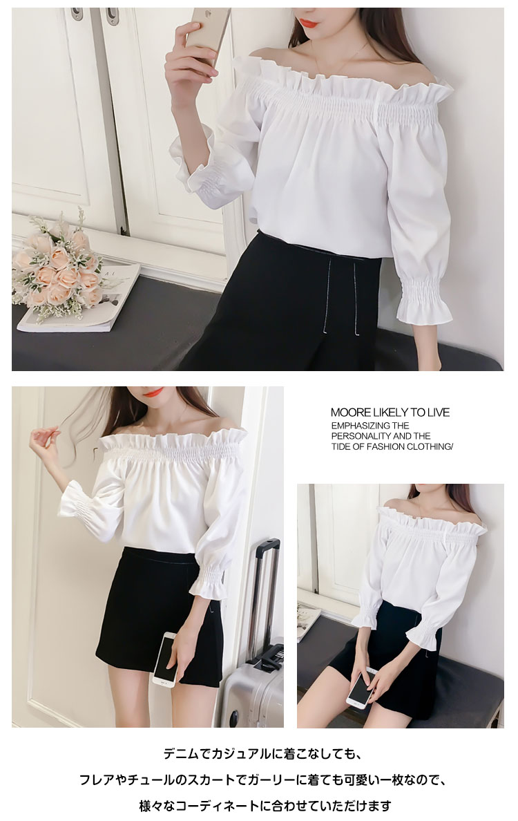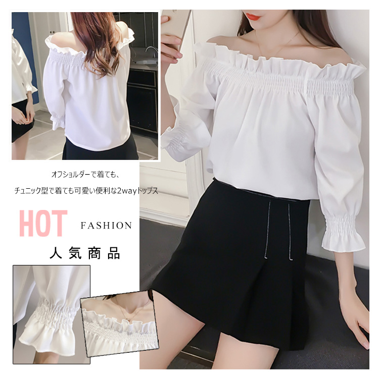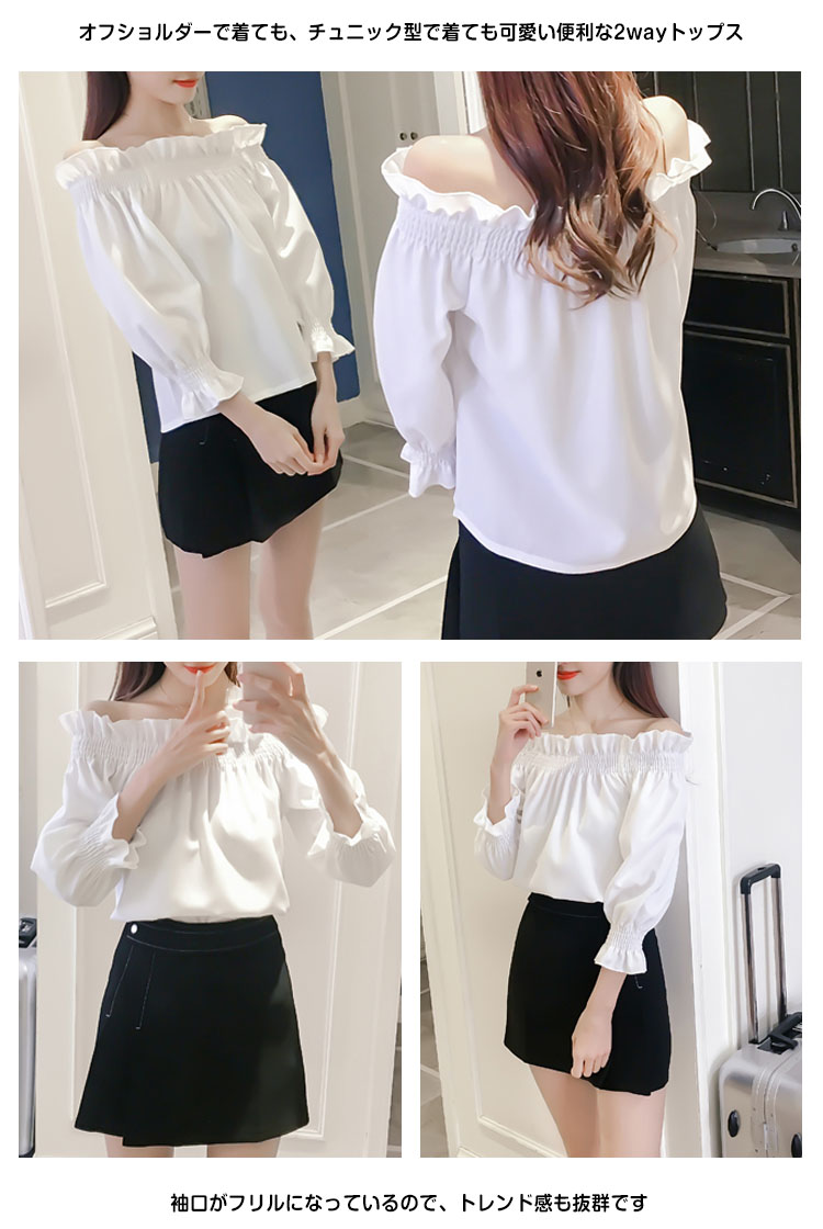 | オフショルダーで着ても、チュニック型で着ても可愛い便利な2wayトップス袖口がフリルになっているので、トレンド感も抜群ですデニムでカジュアルに着こなしても、フレアやチュールのスカートでガーリーに着ても可愛い一枚なので、様々なコーディネートに合わせていただけます今季一枚持っておけば間違いなしのイチオシアイテムです | |