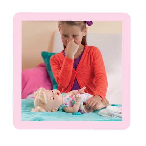 - Feature : Real Surprises Baby doll shakes her head to show what she wants and what she doesn?t / Prepare her "food" / Feed her / Change her diaper when she "pees" and "poops" / Doll speaks English or Spanish