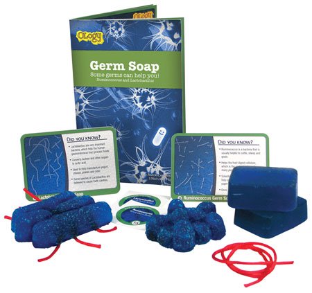 -. Feature : Bar That Germ It's an Ology kit from Action Products. In this case, microbiology. Learn about germs while you make 2 bars of environmentally friendly soap that you can actually use. / This Helpful Germ Soap kit comes with (2) 2-1/4" x 1-1/2" x 3/4" bars of translucent glycerin soap, one mold resembling a Lactobacillus germ and one resembling a Ruminococcus germ, a length of string that represents the cilia (you have to be there to appreciate this), a 7-page fact book, and a fact card for each of the two germs. / All the soap is safe and it's a good way to get smart abut germs.
