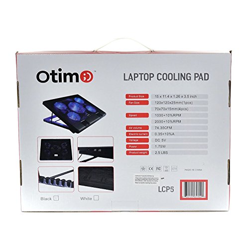 -. Binding : Electronics -. Brand : Otimo -. Color : Black -. EAN : 0630125657041 -. Feature : MAXIMUM PROTECTION: Otimo Laptop Cooling Pad is a laptop overheating solution which uses continuous cooling fans to draw heat away from your laptop / POWERFUL AND QUIET: 5 Ultra Quiet Fans with Blue LED Lights -- 1 (120x120x25mm), 4 (70x70x15mm) -- Fan speed 1 (1000 + 10% RPM) 4 (2000 + 10% RPM) -- Air volume 74.35 CFM / CONVIENIENT: Holds any notebook from 12 to 17" -- Slim and lightweight for portability / ADJUSTABLE: Doubles as angled stand with 6 height adjustment levels -- anti-slip design / CONNECTIVITY: USB Powered with a USB Port to expand connectivity , use as USB hub -- 3Ft USB Cable included -. Label : Otimo -. Manufacturer : Otimo -. Model : LCP5 -. MPN : LCP5 -. PackageQuantity : 1 -. PartNumber : LCP5 -. ProductGroup : PC Accessory -. ProductTypeName : COMPUTER_ADD_ON -. Publisher : Otimo -. Studio : Otimo -. Title : Otimo Laptop Cooling Pad for 12 - 17 inch Laptop -- 5 Ultra Quiet Fans -- USB Powered w/2 Ports -- Adjustable Angled Stand -- USB Hub -. UPC : 630125657041