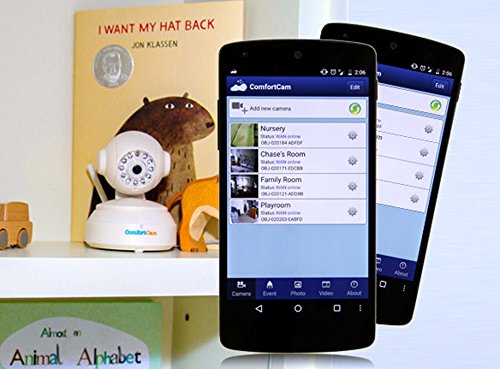 -. Feature : Download Free iOS/Android App to stream directly to your smartphone or tablet, now there is no need to carry around a bulky second monitor, view up to 4 cameras on your screen at once / Combine HD quality viewing with full room coverage of 350° pan and 120° tilt, navigate camera on your smartphone or tablet screen with a simple pinch to zoom and swipe to pan and tilt / The only monitor to provide an in-app Visual Sound Bar along with the ability to set alerts based on noise level and motion detection, speak to your child with our two-way audio system / Unlimited out-of-home viewing with ComfortCam Plus service for just $9.99/month, no extra charge for additional users and cameras / Free 30-day trial of ComfortCam Plus (remote viewing) with every purchase