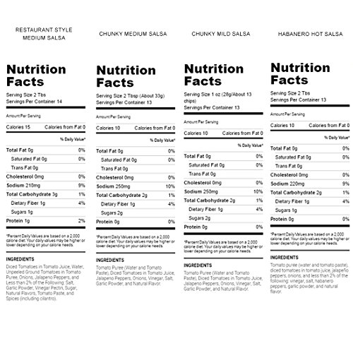 Includes 1 Chunky Medium Salsa, 1 Chunky Mild Salsa, 1 Restaurant Style Medium Salsa, and 1 Habanero Hot Salsa
