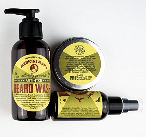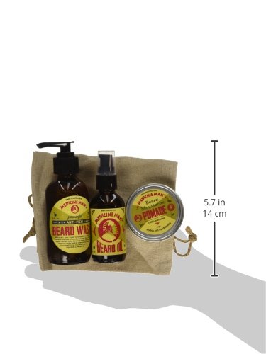 Medicine Man's Beard & Mustache Care Kit: Anti - Itch Beard Wash 4,7 FL OZ, Beard Oil 2 FL OZ, Beard & Mustache Pomade 2 FL OZ - In a Mustache Stamped Linen Pouch