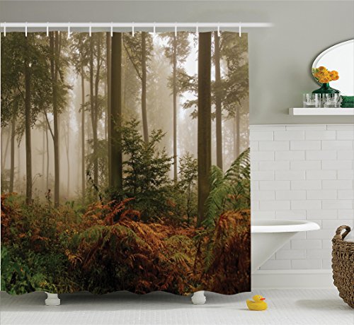 Ambesonne Farm House Decor Collection, Mystical Dark Fog Atmosphere Deep in the Forest Woodland Nobody Silence Image, Polyester Fabric Bathroom Shower Curtain Set with Hooks, Brown Orange Green