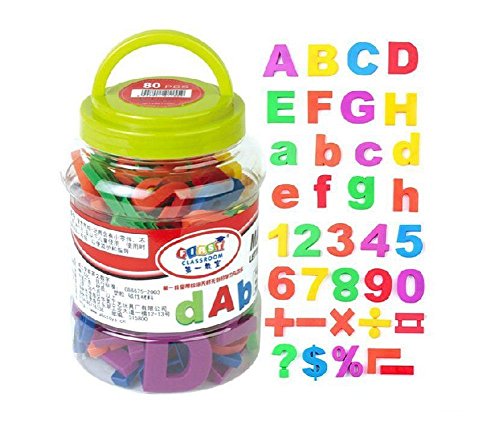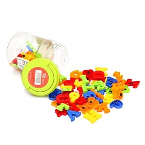 Educational innovative way to learn while playing! Kids love to rearrange magnets on laundry machines and fridge (near a parent!) Builds self esteem - child enters Preschool with knowledge Children familiarize themselves with the shape and value of letters / numbers Bright fun colors include Red Blue Yellow Orange and Green Durable rounded colorful plastic with inset magnets Storage jar with twist off cover and handle Set includes 2 sets of numbers 0-9, Capital letters, lowercase letters and signs. Signs include addition, subtraction, multiplication, division, equals question mark. 0 |