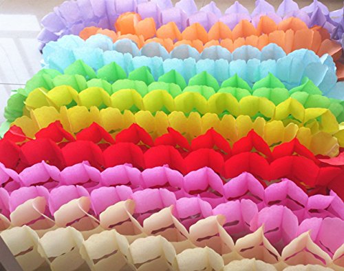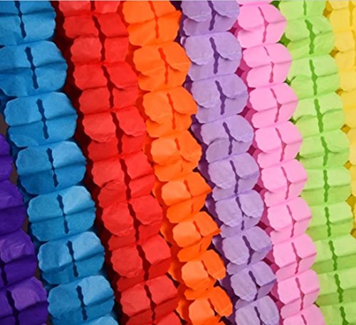 [Description] - Four Leaf Clover Ruffled Tissue Garland Perfect for any occasion: Independence Day_ Birthday_ Wedding_ Christening Baby shower_ Kitchen tea_ Nursery decorations_ Party Background Decoration or any other celebration. - Lightweight and easy to hang them from the ceiling_ above a table_ under the verandah_ or from branches in trees. - Pre-cut pieces for easy folding each sheet and fluff into shape to create beautiful and realistic paper flower. - Hand made using premium paper. -8pcs in a box_ 3.6M long each_ Every One Come with Threading String