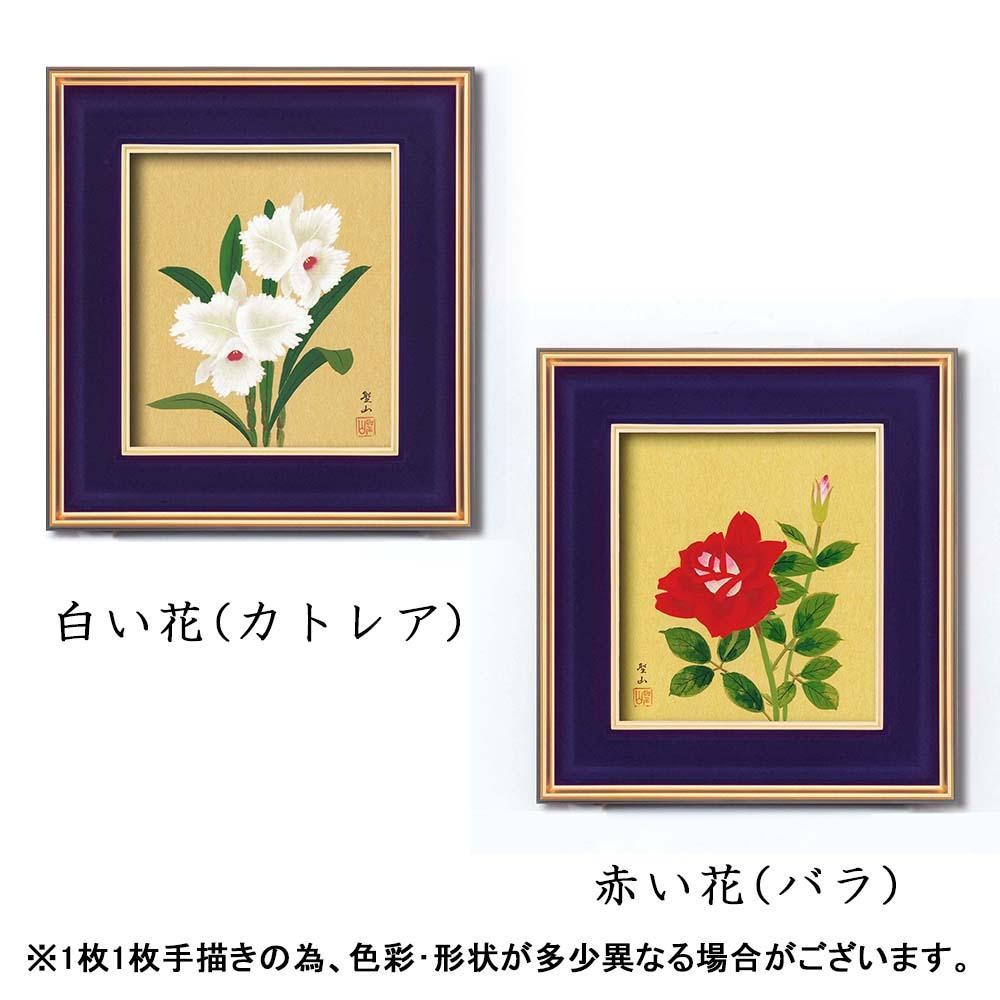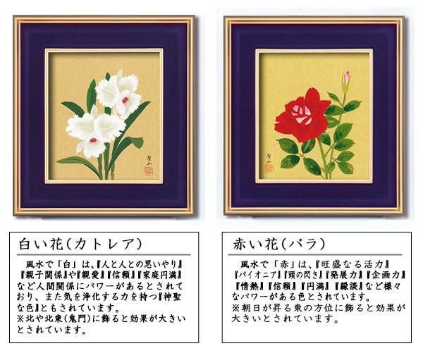 | 豪華な金色の色紙を格調高い黒金の額にセットしました。金運・愛情運など花の色に風水の意味が込められており、吉方に飾ると良いとされています。 |