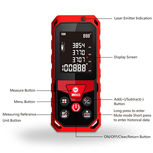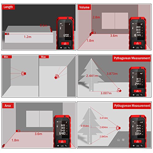- Professional Measuring Device: Multi-Function with Pythagorean Measurement, Area Measurement, Volume Measurement, Addition and Subtract Measurement, Continuous Measurement and Min/Max value measurement. Distance Measuring Range: 0.1 to 196 feet, Extreme Accuracy: 0.006ft. Internal memory can store 20 groups measurements.
