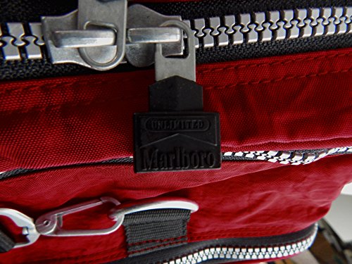 The duffel has a large storage compartment in the middle, two small compartments next to the middle compartment, along with two end compartments and an outside pocket. It has a horseshoe zipper for easy opening and the zipper fobs all feature the Marlboro name.