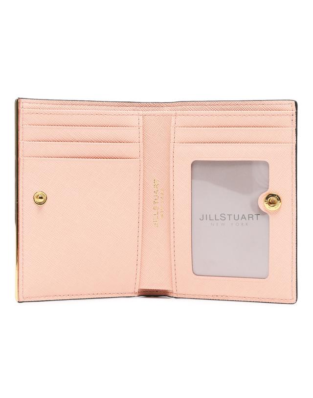 내부 베이비 핑크 배색으로 여성스럽고, 심플한 외관을 보여주며, 하단의 로고와 골드 바 장식으로 포인트를 준 2단 반지갑입니다.