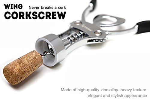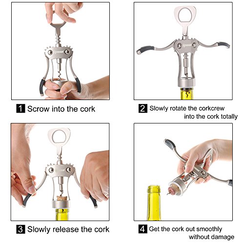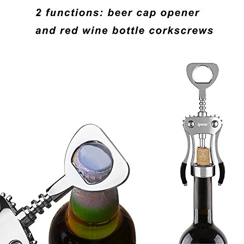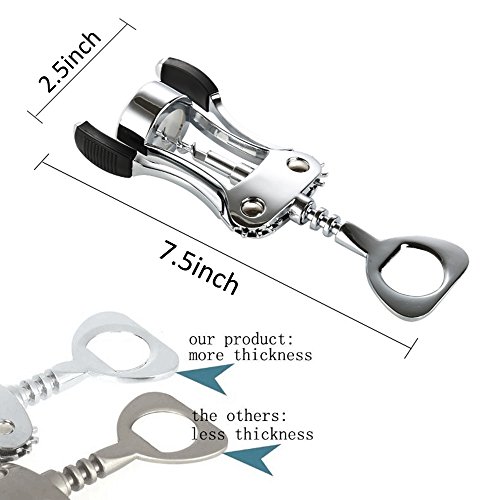 Easy operation: firstly drill into the cork, than put down two wings. Classic winged corkscrew design makes removing corks simple and easy. With metal gears, the corkscrew easily removes wine cork in seconds. 2 functions: beer cap opener and red wine bottle corkscrews. Double levers with tight tension for good leverage. Metal construction to ensure comfortable, confident use.