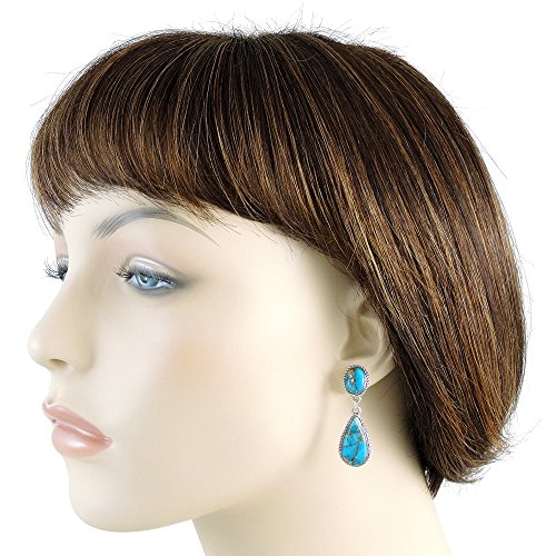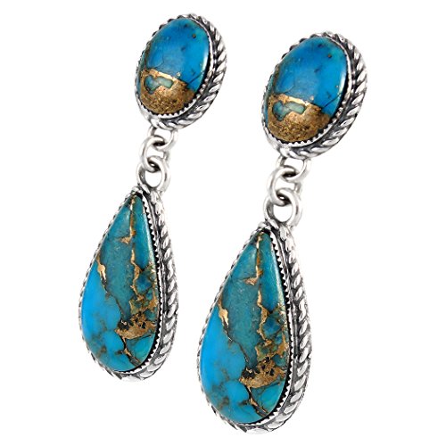Distinctive earrings in 925 Sterling Silver and genuine copper-infused matrix Turquoise. Amazing craftsmanship. About 1/2" wide x 1.5" tall (see ruler image).NOTE: Due to the nature of these gemstones, variations in colors/shades and minor imperfections are normal. Our turquoise has been stabilized, treated, and color-enhanced for beauty and durability. Satisfaction always guaranteed.